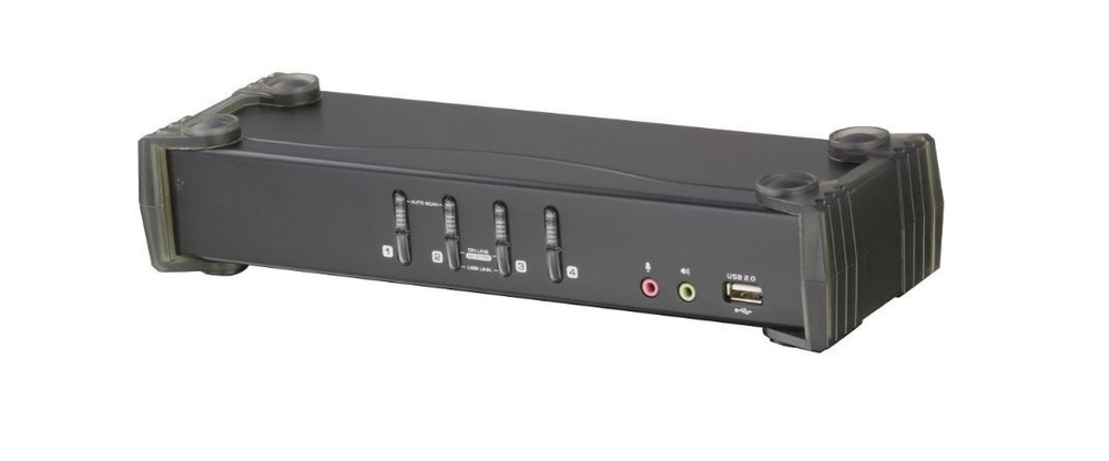 4 ports pc-omskifter til fælles tastatur, skærm, mus, mikrofon og højttalere (KVM-switch). Der skal benyttes USB-mus og -tastatur. Der er 2 USB-porte til deling af USB-enheder mellem pc’erne.