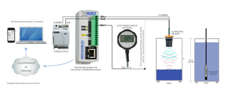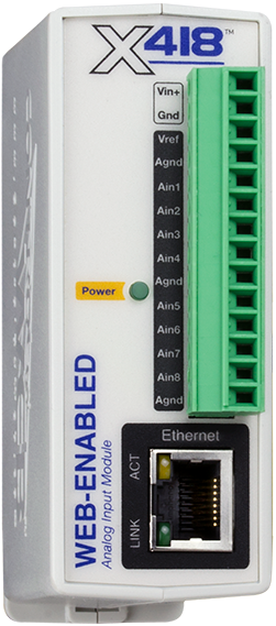 Push sensor data for other controlbyweb modules. No software required, no programming required and no subscription to buy. 8 analog inputs (multifunction) ± 1.28V, ± 2.56V, ± 5.12V, ± 10.24V, 4-20mA. Can be configured for single-ended, 4 channel differential or 4-20mA (0-20MA) input operation. Monitor industrial sensors, wind direction sensors, pyranometers, pressure transducers and much more.