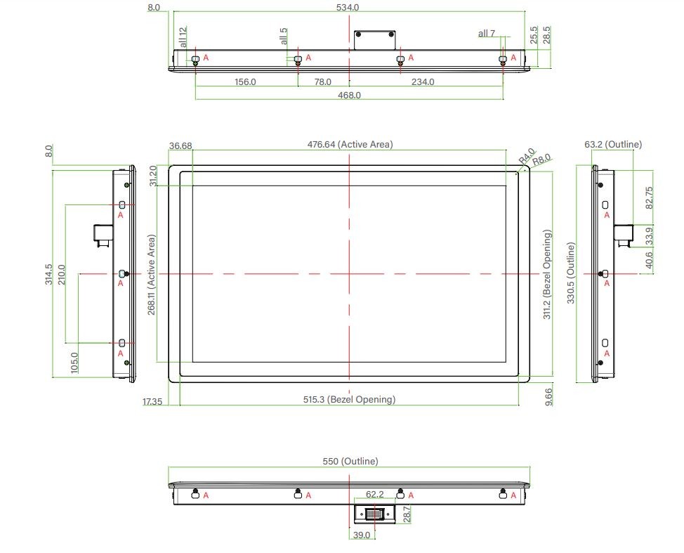 21.5" Monitor 16:9 TFT-LCD, Projected Capacitive Touch (PCAP), IP65 front, 9~48VDC