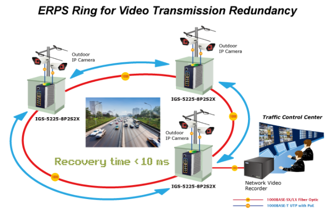ESW8G-M-SFP4P supports redundant ring technology and has fast self-learning function to prevent interruptions. ITU-T G.8032 ELEPS technology (Ethernet Ring Protection Switching), Spanning Tree Protocol (802.1 MSTP)
