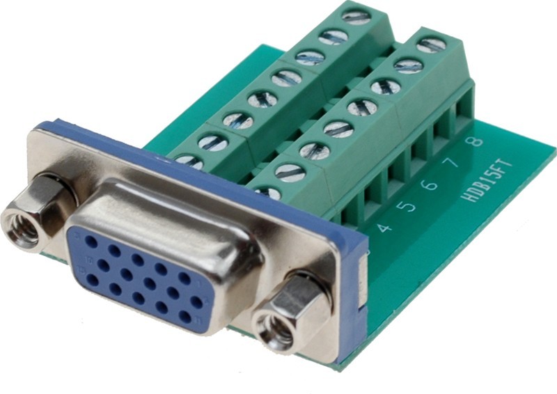 Terminal block with VGA DB15HD female plug. Adapter with 16 screw terminals
