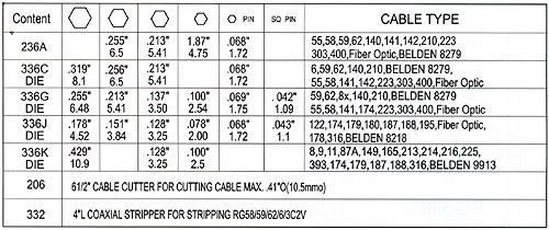 336C: RG6, 59, 62, 140, 210, BELDEN 8279, 55, 58, 141, 142, 223, 303, 400, Fiber Optic