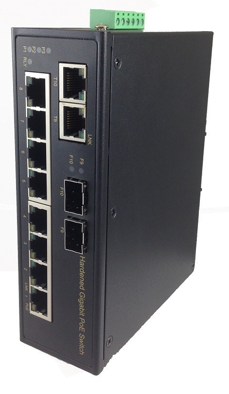 ESW10G-2SFP-P er en industriel PoE+ switch med mulighed for to SFP moduler. Den kan levere op til 36W per port, dog max 240W totalt over alle 8 porte, og kun ved 56VDC.