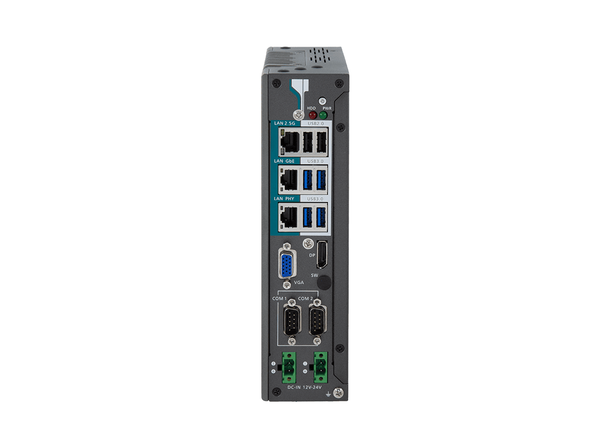 Fläktlöst stöd för Intel® 14:e/13:e/12:e generationens Core™ 35W CPU, 2xCOM 8xUSB, 2xLAN, HDMI, DP, DIN-montering, DC 12~24V