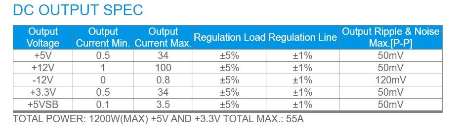| Output | Max. +12VDC 100A, Max +3.3 VDC 34A, Max +5VDC 34A |