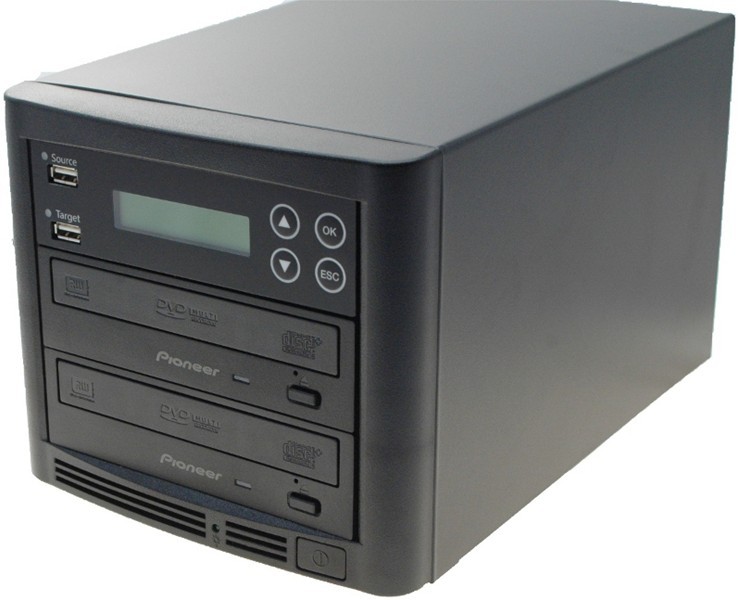 KOPI-DVD+USB är lämplig för kopiering av ett litet antal CD-, DVD- eller USB-media. Originalmediet och ett tomt material placeras i separata lådor. Brännaren aktiveras sedan via kontrollpanelen. Genom att använda USB-portarna kan kopiering till och från USB-enheter också göras i kombination med CD/DVD-enheter.