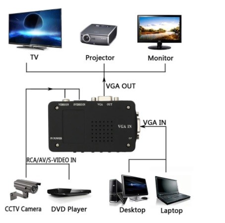 Composite och S-Video till VGA-omvandlare. Anslut analog kamera etc. till VGA-skärm. Max. 1600x1200. 5VDC