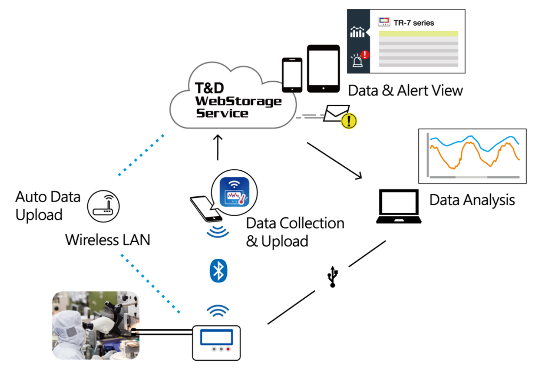 Det är perfekt för inte bara hemmet och kontoret utan också för forskningslaboratorier, sjukhus och stora institutioner. LOG-L71 använder en trådlös LAN-åtkomstpunkt för att automatiskt överföra inspelade data och varningsmeddelanden till vår kostnadsfria molnbaserade "TD WebStorage Service" eller din Windows-dator som kör programvaran "TD Data Server". Använd vår mobilapp “TD Thermo” för att styra data från din smartphone eller surfplatta och använd Bluetooth-kommunikation för att göra inställningar och ladda ner inspelad data. För att göra inställningar från och ladda ner data via USB till en dator behöver du vår Windows-programvara. Vår Windows-programvara "TD Graph" gör det enkelt att visa och analysera data från din dator.