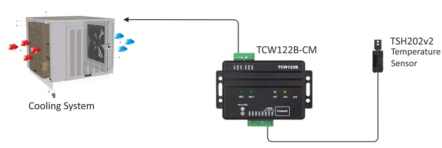 TCW122B-CM stöder 1-trådsgränssnitt. Upp till två temperatur- eller fuktighetstemperatursensorer kan anslutas. Tillsammans med omgivningsparametrar kan två analoga spänningar och statusen för två digitala ingångar övervakas. För varje parameter kan e-post och/eller SNMP-fälla skickas för alla larmtillstånd.