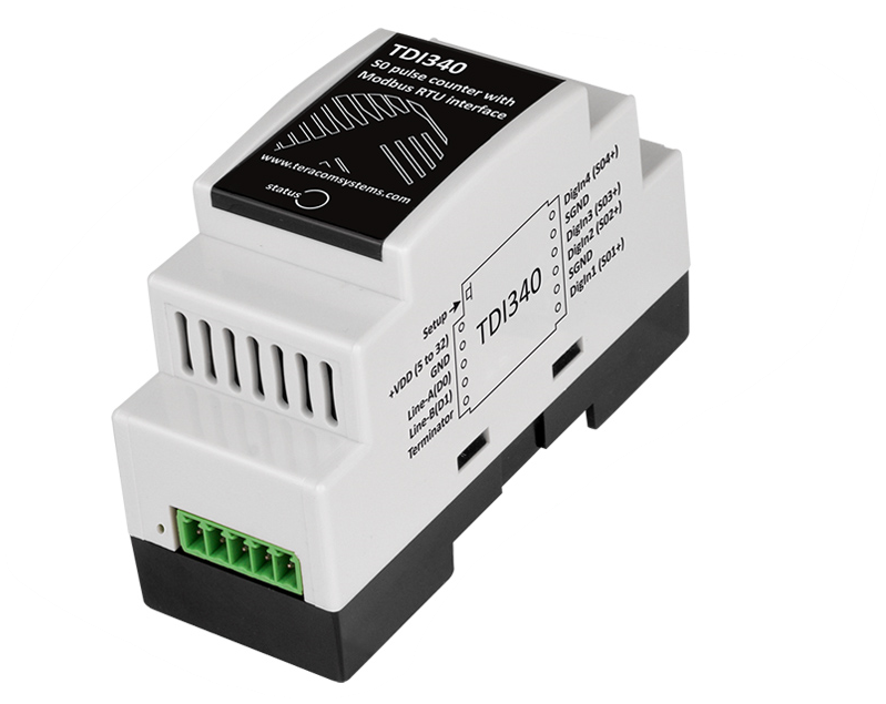 TDI340 är en S0-pulsräknare med MODBUS RTU-gränssnitt. Den har 4 isolerade digitala ingångar som uppfyller S0-standarden 62053-31. S0-pulsräknaren arbetar i polling- eller nivåändringsläge. I nivåändringsläge kan modulen ställas in att räkna på stigande, fallande och båda nivåändringarna. Enheten är en dedikerad S0-pulsräknare, men den ger också samtidiga avläsningar av statusen för digitala ingångar - ÖPPEN/STÄNGD.