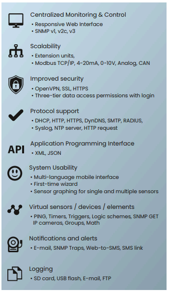 Fjärrmiljöövervakningsenhet för små IT-rum mm. Övervaka temperatur, luftfuktighet, spänning, läckage, rök, luftflöde och andra parametrar.