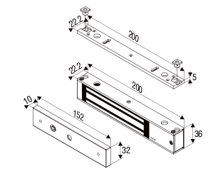 Dimensioner Holdemagnet: 170 x 32 x 24mm. Plade til dør: 152 x 32 x 10mm