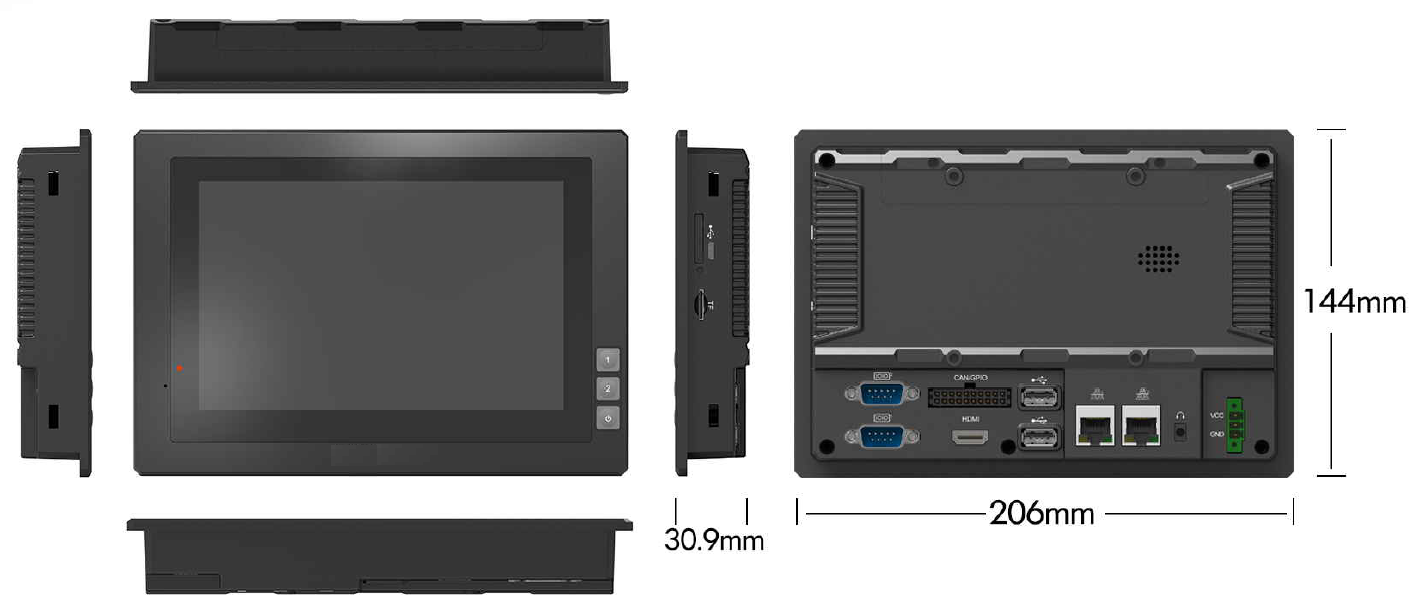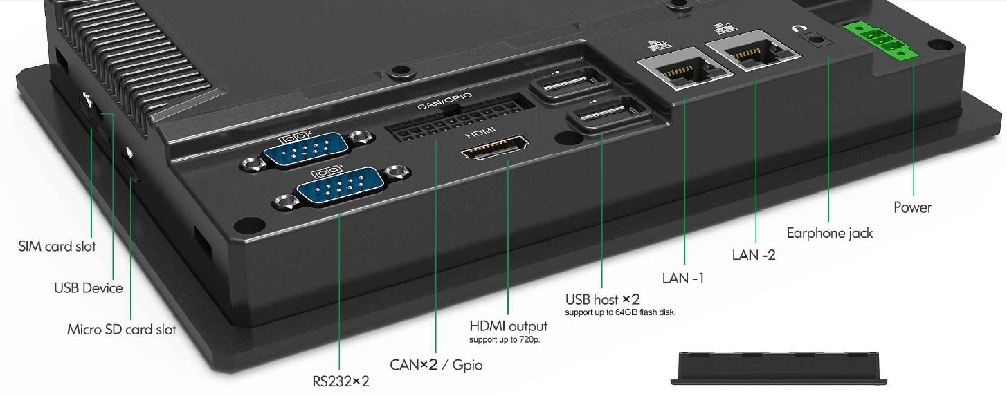 7” smart och robust industri-PC, expansioner rik funktion som WiFi, 4G LTE, Bluetooth för trådlös kommunikation; HDMI-utgång, USB Host och LAN-portar för olika realtidsöverföring; Dessutom konfigurerat den med standard professionell gränssnitt:. RS232 / GPIO portar för olika industriella applikationer