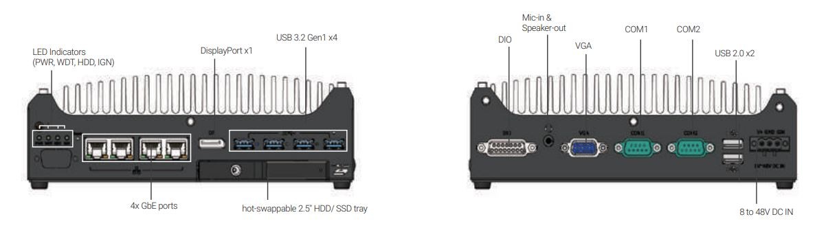 Den har omfattande I/O-funktioner. Den har fyra GbE- och fyra USB 3.2 Gen 1-portar för flera kameraanslutningar. Dessutom har den en Gen4 x4 M.2 NVMe-plats för de senaste NVMe SSD-diskarna, med stöd för läs-/skrivhastigheter på upp till 7000 MB/s. Den har också ett andra hot-swap-hårddiskfack för att hot-swap-a lagringsenheten utan att stänga av systemet eller ta bort chassit. Det finns två mPCIe- och en M.2-nyckelplats för att installera WiFi eller 5G/4G för trådlös kommunikation. Dessutom är den utrustad med 8x DIO-, 2x COM-portar och dubbla bildskärmsutgångar för dina applikationsbehov.
