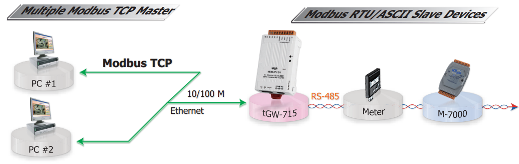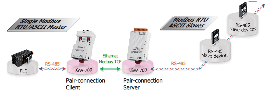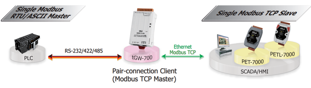 ETH-MODGW7xx serien är en Modbus-gateway som möjliggör en Modbus TCP / IP - UDP värd att kommunicera med seriell Modbus RTU / ASCII fjärrterminalenheter via ett Ethernet-nätverk, vilket eliminerar kabellängd begränsning av etablerade och seriell kommunikationsanordningar . Modulen kan användas för att skapa ett par-anslutning ansökan (par-anslutning) samt seriell-bro eller seriell-tunnel ansökan) och kan då dirigera data över TCP / IP mellan två seriella Modbus RTU / ASCII-enheter, är användbar när du ansluter stordatorer, servrar eller andra seriella enheter med Modbus RTU / ASCII-protokoll och har inte ens Ethernet kapacitet. Det maximala antalet TCP-anslutningar för varje serieport är upp till 32 (RevB), detta har flera master tillgång till slav enheter i samma serieport. Läs cache-funktionen används för att spara tidigare förfrågningar och svar i minnesbufferten i ETH-MODGW7xx. När andra HMI / SCADA ordnade styrenheten sänder samma förfrågningar till samma RTU slav anordningen återgår den cachade svaret omedelbart. Detta särdrag reducerar dramatiskt belastningen på de seriella