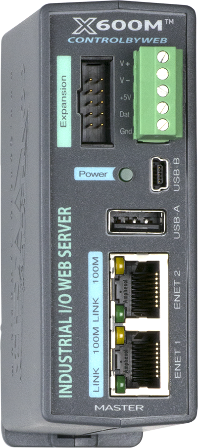X-600M-I fungerar som en kraftfull huvudkontroller för andra ControlByWeb™-moduler. Med den speciella platta sammankopplingskabeln är det möjligt att ansluta upp till 64 expansionsmoduler direkt till X-600M-I. Den kan också styra vilken som helst av våra andra fristående ControlByWeb-enheter över ett Ethernet-nätverk med upp till 128 enheter.