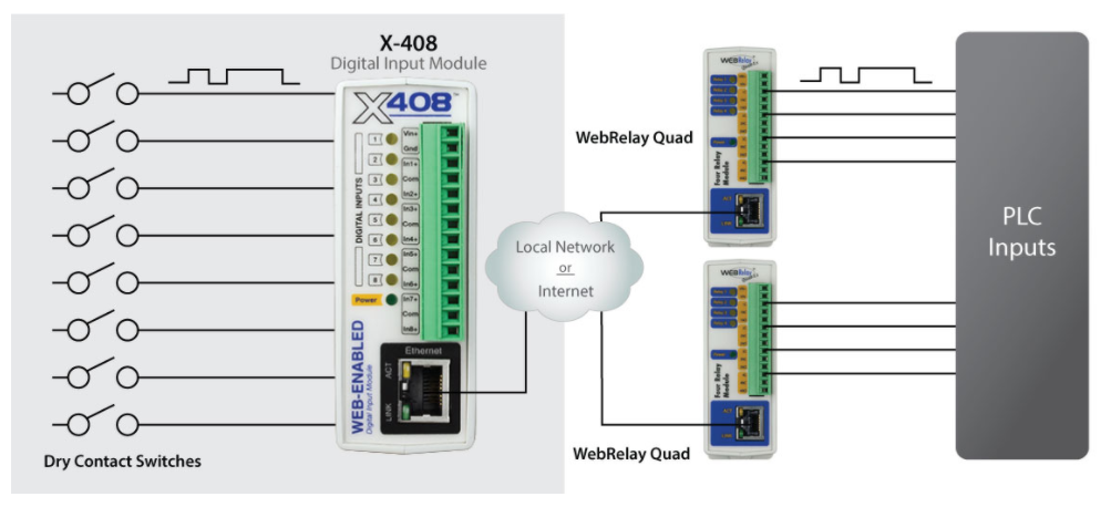 I / O - Spegling: X-408 kan användas i ett större, distribuerat system. Illustration visar hur X-408 arbetar med andra ControlbyWeb-produkter för I / O-spegling.