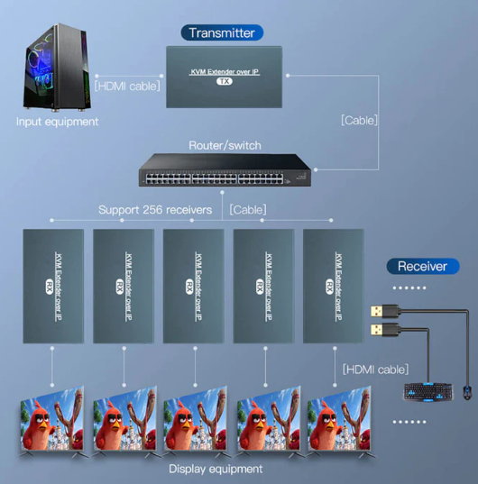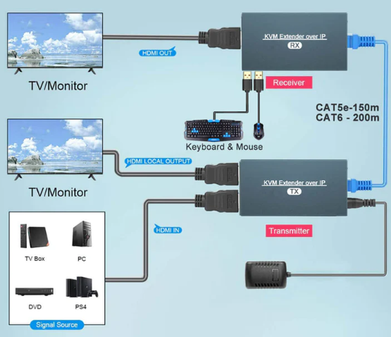 HDMI KVM-förlängare, 150 meter över Cat 6a / 7 RJ45-kabel, eller över TCP/IP, USB HID