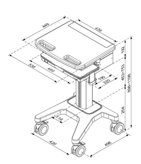Mounting Option: Laptop cart Weight Capacity: 1~5 kg (2.2~11 lbs) Height Adjustment Range: 898~1198mm ( From theground to the top of work surface ) Main Material: Aluminum alloy /Stainless steel / ABS(VO) Lift Mechaneism: Gas spring Work Surface: 538(W)×449(D) mm withintegrated forward-facing hanedles Caster: 4 casters" 2 locking