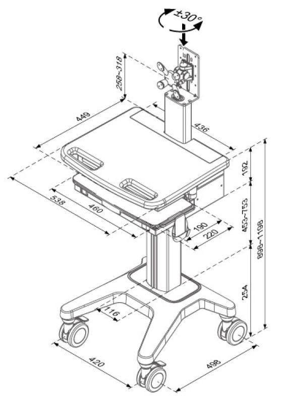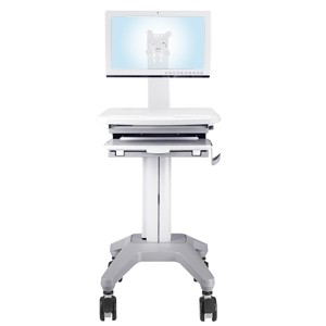 Dess kompakta och lilla fotavtryck är perfekt för patientområden och små utrymmen i sjukhusinställningar. Lättviktstorlek och liten profilkonstruktion ger flexibilitet "rörlighet och användarvänlighet. Den är höjdjusterbar för användare av stående och sittande arbetsställningar. Utdragningsbrickan innehåller vänster till höger glidande musfack. Det kan rymma en batterikälla och en brett utbud av medicinska tillbehör.