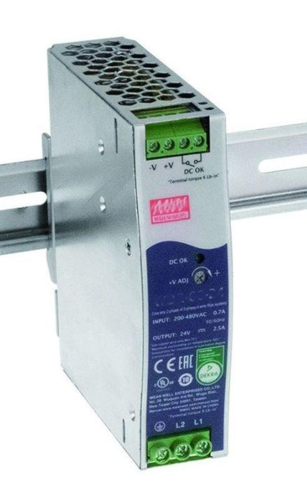 24VDC 60W strömförsörjning. Ultrabred AC-ingång från 180VAC-550VAC. 24V/2,5A, Finjustering från 24-29V, DIN-montering