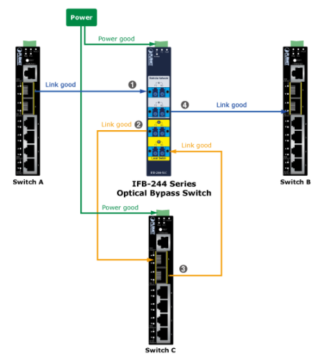 När ett strömavbrott inträffar, fungerar FIBER-BYPASS-XX serie i en omkoblingstilstand inom 8 millisekunder, som direkt vidarebefordrar Ethernet-paket mellan två externa fiberomskiftere och kringgår den lokala fiberomskifter.
