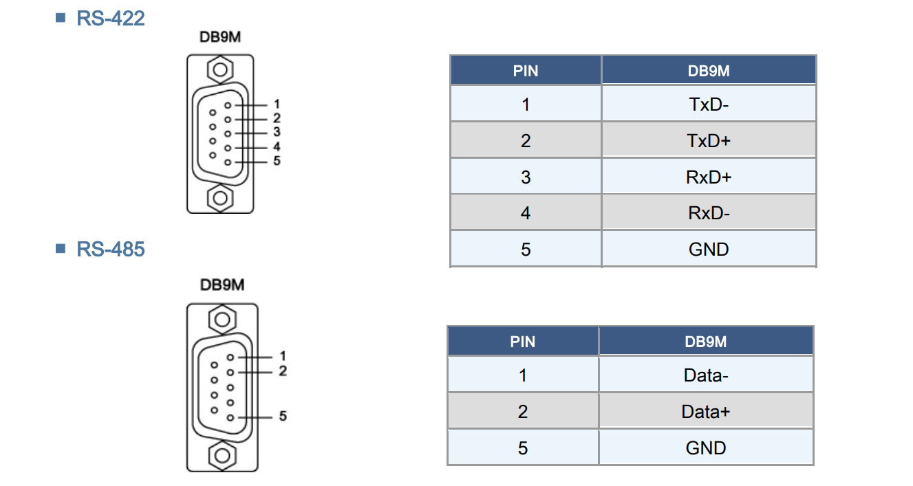Signaler RS-422: TxD+, TxD-, RxD+, RxD-, GND 4-wire RS-485: TxD+, TxD-, RxD+, RxD-, GND 2-wire RS-485: Data+, Data-, GND