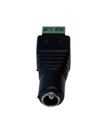 DC kontakter (5,5/2,5 mm) med hona kopplingsplint bestående av två skruvklämmor indikerande plus / minus-anslutning