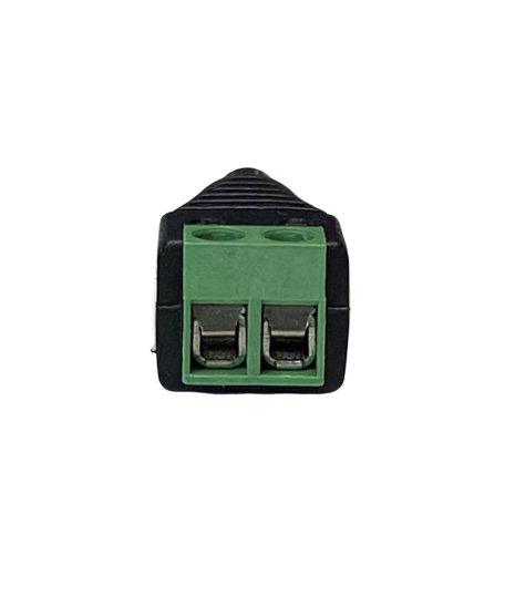 DC kontakter (5,5/2,5 mm) med hane kopplingsplint bestående av två skruvklämmor indikerande plus / minus-anslutning