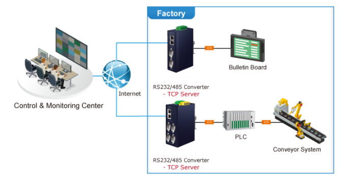 Processkontroll: För att övervaka, konfigurera och haneeetera robottransportören inklusive andra produktionsmaskiner som krävs PLC (programmerbar logisk kontroll) för att köra Ovanstående tillverkningsprocess. Eth2Ser-IC kan ställas in på TCP-serverläge och anslutas till PLC. Således kan administratören konfigurera och ställa in komhaneeedoinställningar via den snabba Ethernet-intran för fjärrkontrollen av PLC utan att behöva stå vid maskinen.