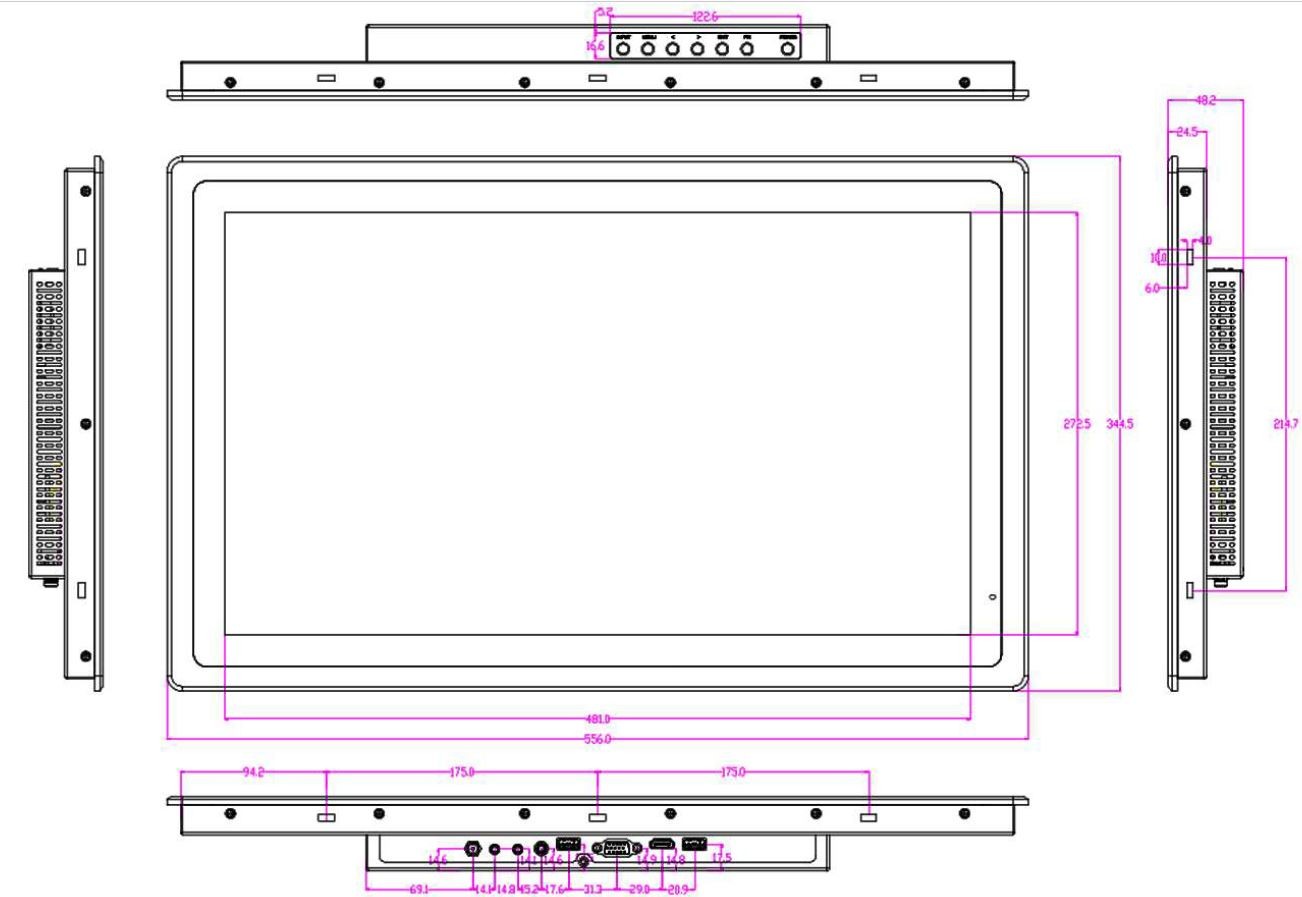 21,5" TFT 16: 9 panelmonitor 1000Nits, HDMI, VGA, kompositvideo, 12-24Vdc, PCAP Touch 10 punkter, IP65 på framsidan