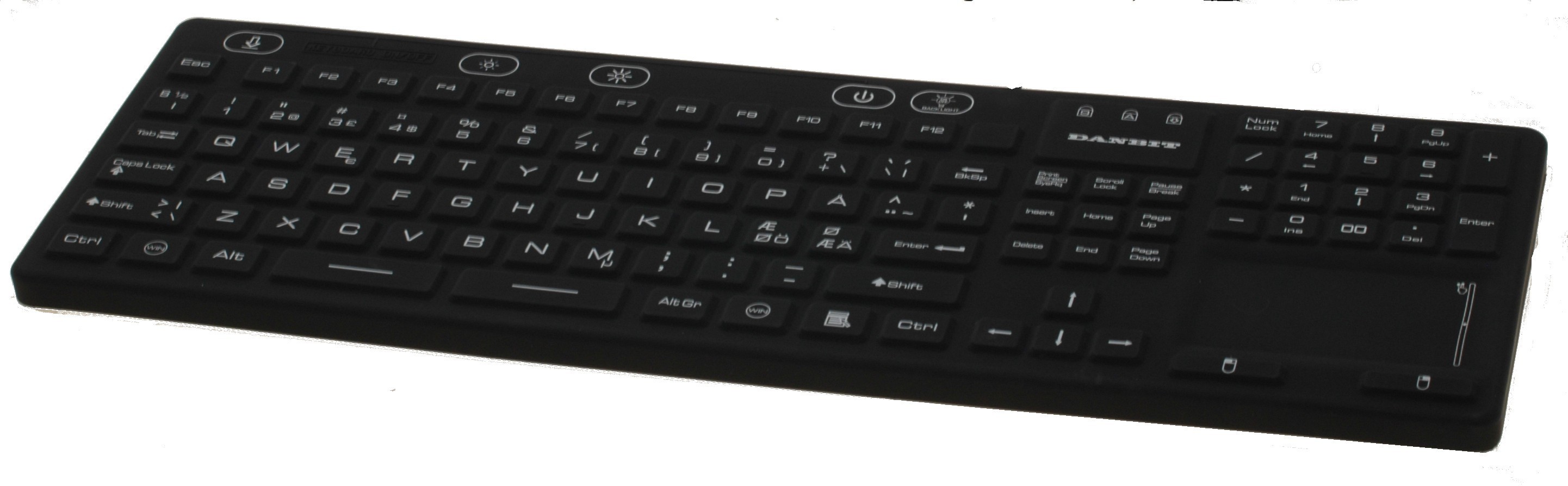 IP68 förseglat medico tangentbord med pekplatta, USB, nordiskt tecken, svart med bakgrundsljus. ON/OFF-knapp för rengöring.