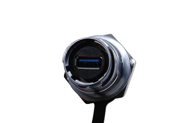 Vattentät USB3.0 chassi honkontakt, IP67 med lock, 1 meter kabel med USB A hane. Bajonett för kabelkontakt. Plast.