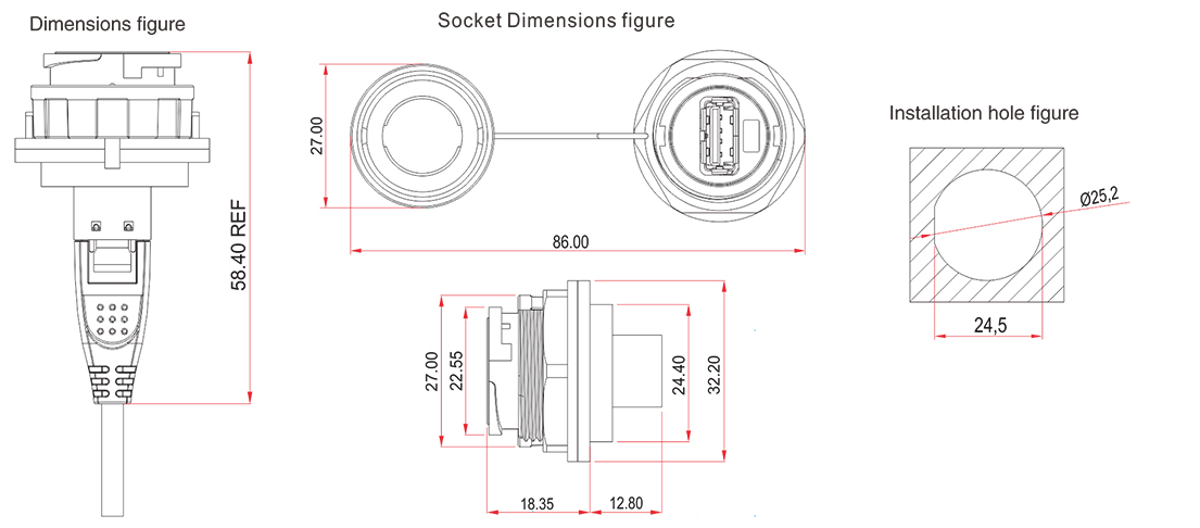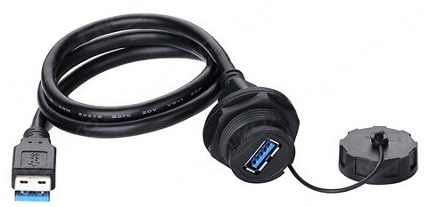 Vattentät USB3.0 chassi honkontakt, IP67 med lock, 1 meter kabel med USB A hane. Bajonett för kabelkontakt. Plast.