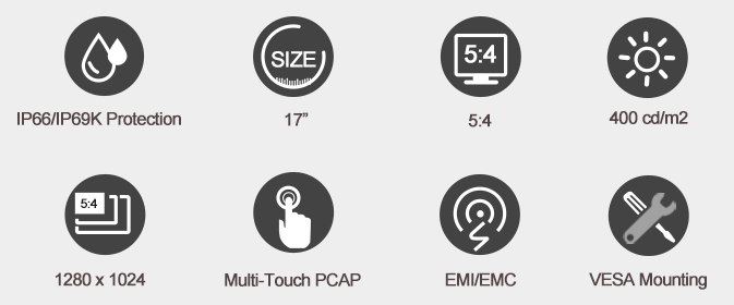 17" IP66/IK69 helt förseglad industriell bildskärm, 1280 x 1024, 400nits, HDMI, Multi-PCAP touch, 5:4-format