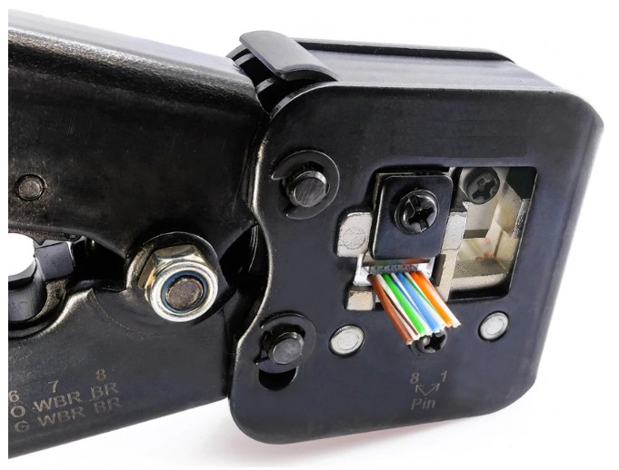 Krimpverktyget klämmer fast kontakten på kabeln och avslutar avskärning av de 8 ledningarna så att de spolas i kontakten. Snabb, säker och smart.