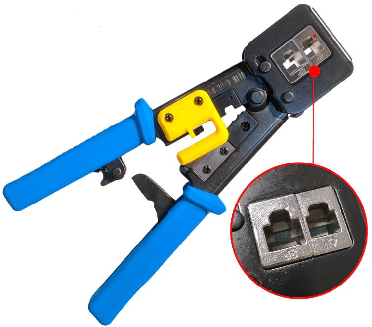 Pressverktyg för RJ45-kontakter - med genomgående hål för heads - Pressning och skära av ändarna i samma operation