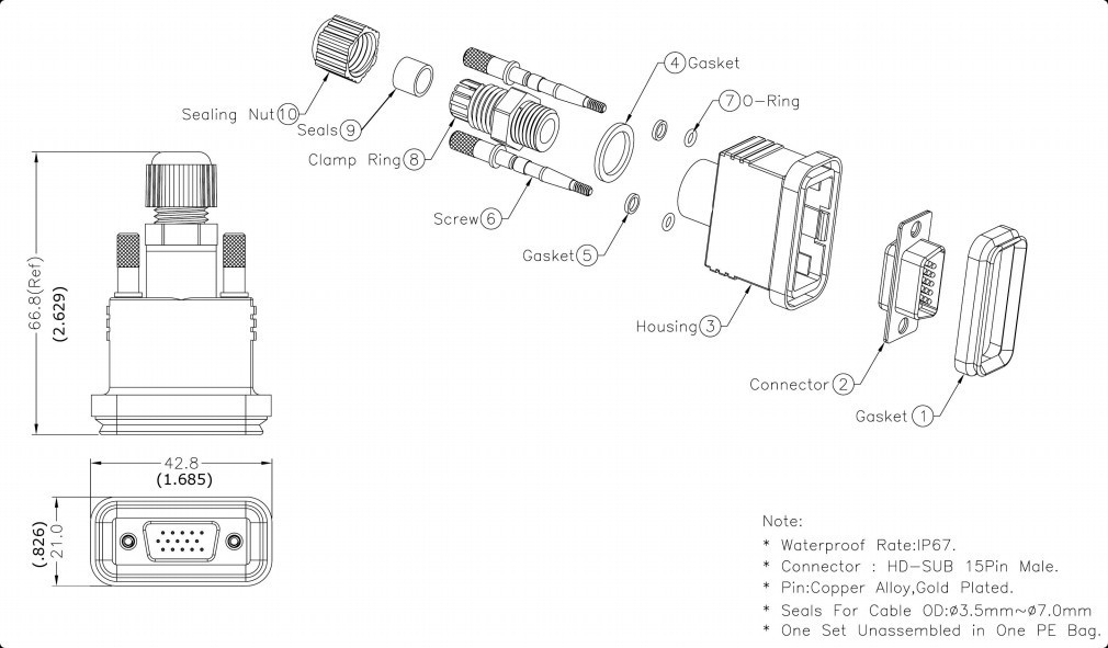 IP67 vattentät VGA, DB15HD, HD-Sub hanekontakt. För utomhus (industriell) Användning