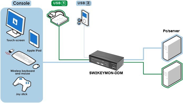 Är designad för att växla mellan 2 datorer i en industri- eller kontorsmiljö. Inte lämplig för speldatorer eller spelhårdvara!