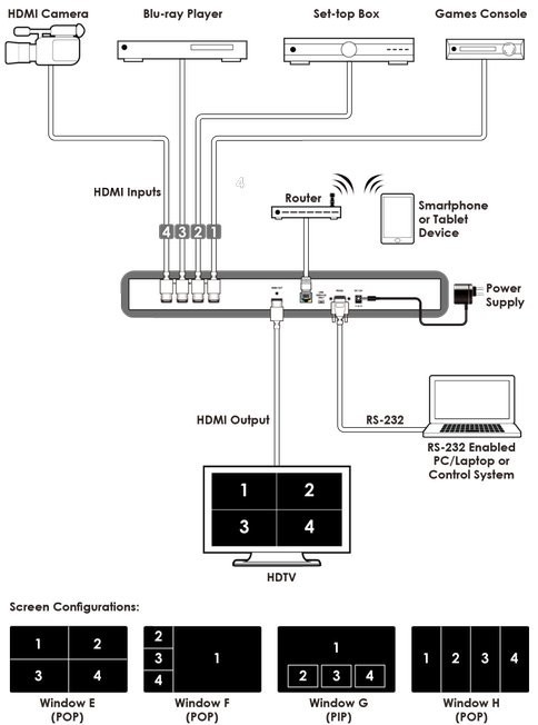 4 bilder på samma skärm HD. 4 x HDMI-ingångar till en HDMI-utgång. Med QUAD, PIP, POP, sida vid sida. 1080p, fjärrkontroll
