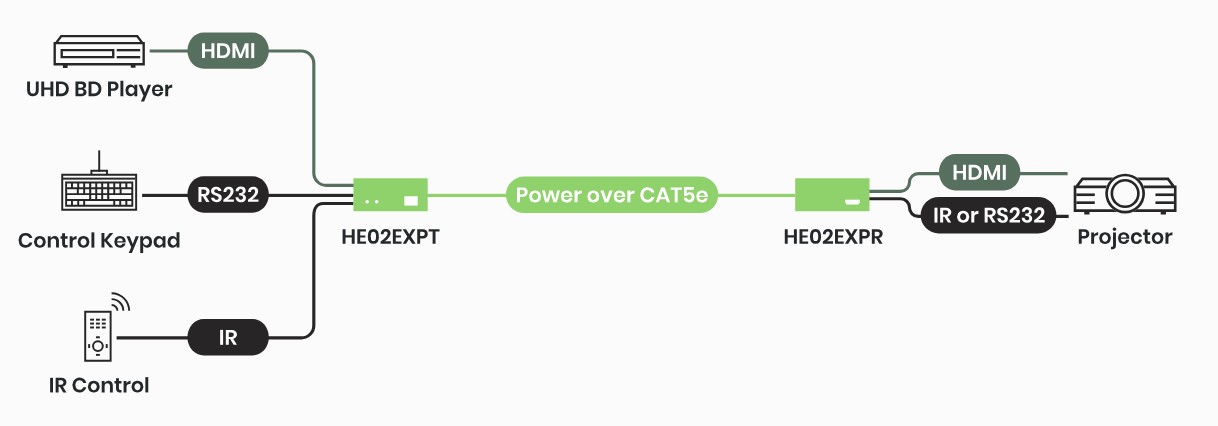 Premium HDMI-förlängare designad för högpresterande AV-system. Den levererar full 4K@60Hz (4:4:4) videosignal, tillsammans med IR, RS232-kontroll och ljud, via en enda CAT5e-kabel, upp till 70 meter. Power over HDBaseT (PoH)-funktion gör att enheten kan strömförsörjas från antingen sändar- (TX) eller mottagar- (RX) sidan för större flexibilitet.