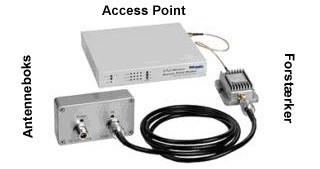 Utomhusversionen (WLAN-BOOST1K-U), som visas här med injektor och accesspunkt.